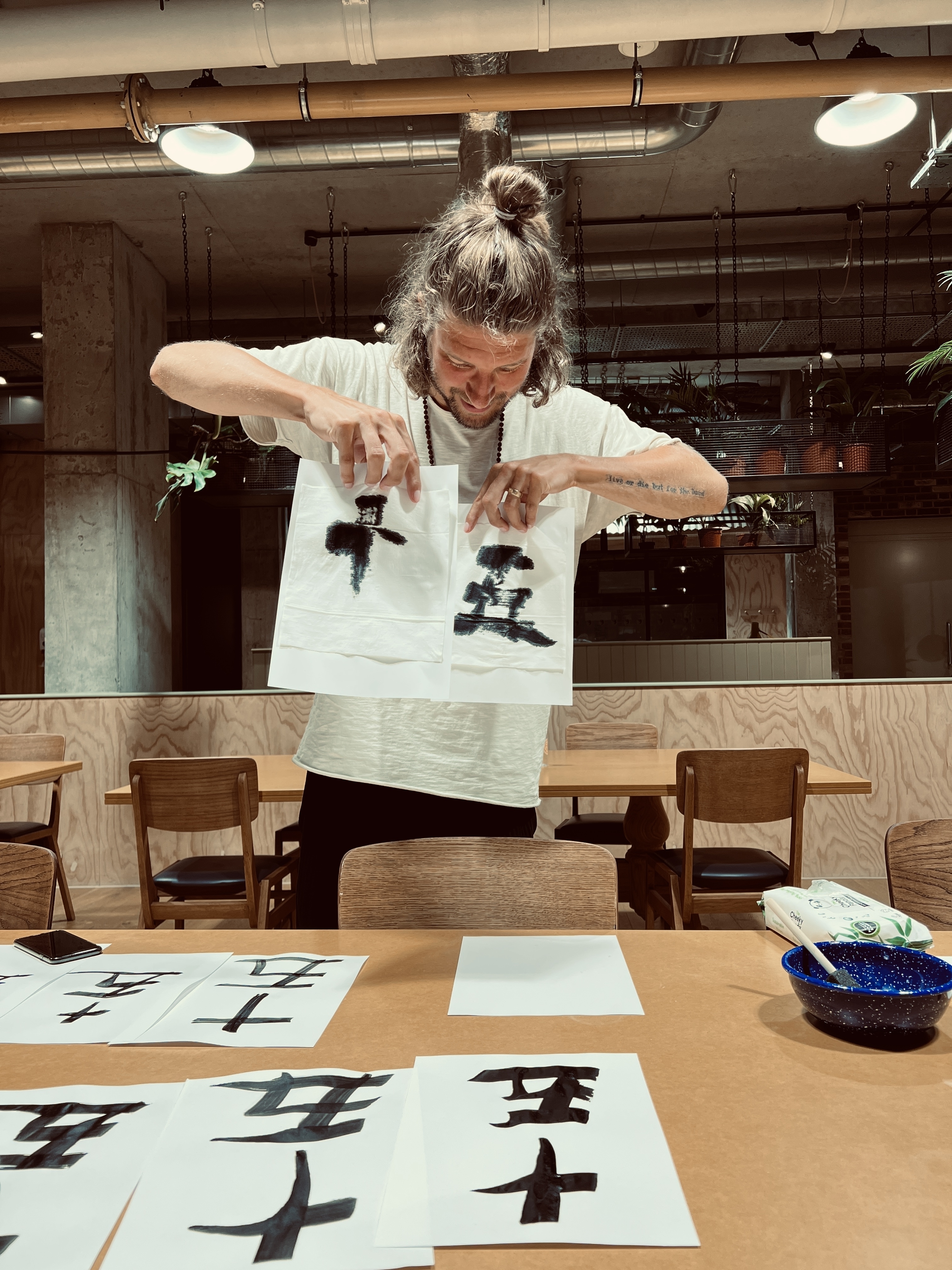 My year coincidentally started in Japan. I remember visiting a temple on New Year’s Eve, and even though I’m not of the same religion, it had a deep effect on me, especially after recent events, in that I felt so grateful to be able to begin it from the other side of the world, with a different perspective on things. I decided at that moment that I wanted to dedicate this year to that feeling. Around the same time I was starting to embrace the art of calligraphy, and also the fact that I love playing with language. Over the years I’ve found it more and more difficult to express what we do in words, through letters and numbers. I love what ink does on textural paper, especially if it’s not super controlled in a traditional way but more expressive and free.